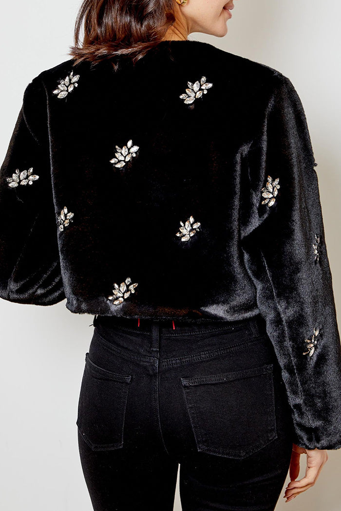 We're glad you've clicked on our new Black Faux Fur Rhinestone Cropped Jacket as we're really into its casual vibes! The unique design make this a great choice for any stylish girl.