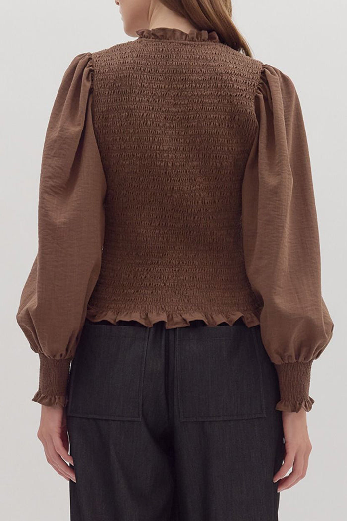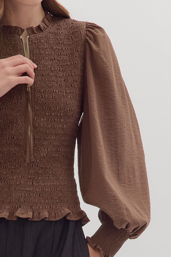 We're glad you've clicked on our new Puff Sleeve Zipper Top as we're really into its casual vibes!Featuring long puff sleeves and a smocked bodice for a flattering fit, this lightweight woven piece is finished with a gleaming gold half-zip closure for just the right touch of sophistication. Effortless yet statement-making.
